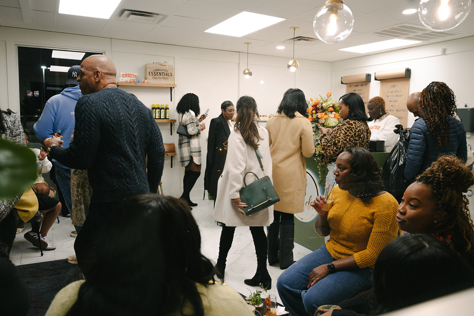 Our space comfortably seats 15 guests. Two 5ft long high tops are available for setting up our catered food, or your own decorations.